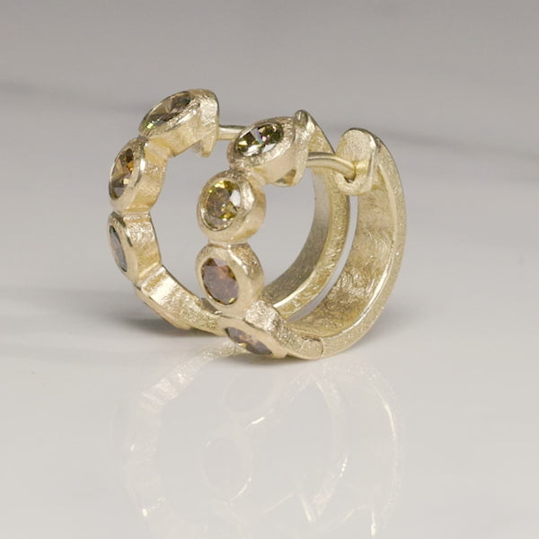 These beautiful huggie hoop earrings are hand fabricated in 18 karat yellow gold with Autumn™ brilliant cut diamonds