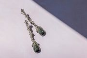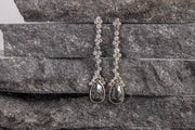 Hand fabricated dangle earrings with natural black fancy cut diamonds, grey rose cut diamonds, and silver rose cut diamonds set in palladium.