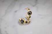 Beautiful statement hoop earrings with black rose cut diamonds and black brilliant cut diamonds set in 18 karat yellow gold.