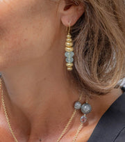 Beautiful hand fabricated dangle earrings with aquamarine beads and stacked 18 karat yellow gold elements.