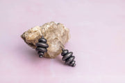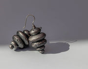 One of a kind hand fabricated earrings with black brilliant cut diamonds set in stacked round patinated sterling silver elements.