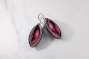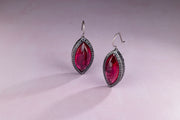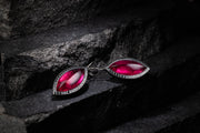 Incredible one of a kind earrings hand fabricated in patinated sterling silver with rubellite and black brilliant cut diamonds.