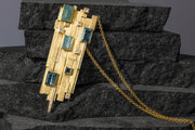 One of a kind hand fabricated pendant necklace with white brilliant cut diamonds, white princess cut diamonds and clear blue aquamarine set in 18 karat yellow gold on a 14 karat yellow gold chain.