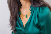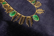 Beautiful one of a kind bib necklace with natural emerald slices and white brilliant cut diamonds set in 18 karat yellow gold.