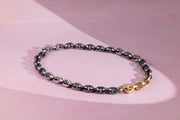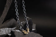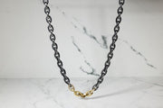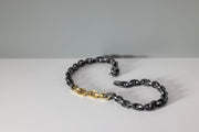 Hand fabricated chain link necklace with black brilliant cut diamonds and white brilliant cut diamonds set in 18 karat yellow gold and patinated sterling silver.