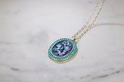This beautiful one of a kind necklace is hand fabricated in 18 karat yellow gold and turquoise beads surrounding a large piece of onyx with carved flowers.