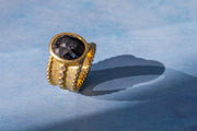 One of a kind hand fabricated ring with a large natural black fancy cut diamond and white brilliant cut diamonds set in 18 karat yellow gold.