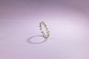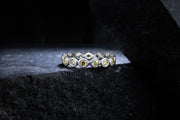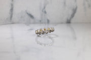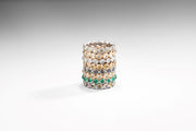 Palladium eternity band with bezel set green brilliant cut diamonds.