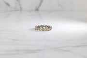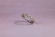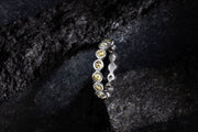 Hand fabricated eternity band with natural yellow rose cut diamonds set in palladium.