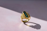 Beautiful one of a kind ring with large green emerald cut tourmaline, white baguette diamonds, and cognac baguette diamonds set in 18 karat yellow gold.