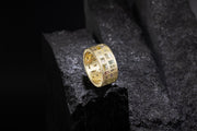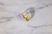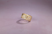Beautiful hand fabricated ring with pastel colored baguette diamonds set in 18 karat yellow gold.