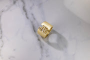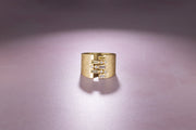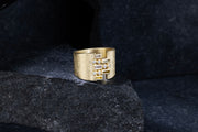 Beautiful hand fabricated ring with natural pastel colored baguette diamonds and white brilliant cut diamonds set in 18 karat yellow gold.