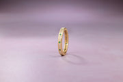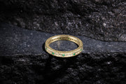 This beautiful eternity band is hand fabricated in 18 karat yellow gold with flush set white brilliant cut diamonds and emeralds.