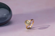 Beautiful hand fabricated engagement ring in 18 karat rose gold with a natural grey diamond and white diamond halo.