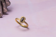 Hand fabricated engagement ring in 18 karat yellow gold with a natural black diamond and white diamond halo.