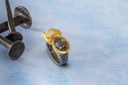 One of a kind hand fabricated ring with a natural black fancy cut diamond and a large rough diamond set in 18 karat yellow gold and patinated sterling silver.