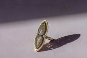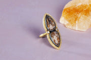Beautiful one of a kind ring with two large fancy cut pear shaped diamonds and white brilliant cut diamonds set in 18 karat yellow gold and patinated sterling silver.