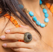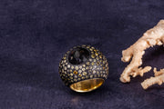 Beautiful one of a kind ring with a natural black rose cut diamond and olive brilliant cut diamonds set in 18 karat yellow gold and aluminum.