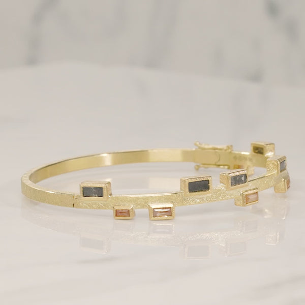 Beautiful hinged bangle hand fabricated in 18 karat yellow gold with coral baguette diamonds and black baguette diamonds