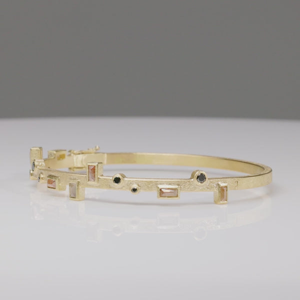 Hinged bangle hand fabricated in 18 karat yellow gold with coral baguette diamonds and black brilliant cut diamonds