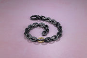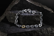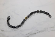 Hand fabricated ovular link bracelet in patinated sterling silver with black brilliant cut diamonds set within an 18 karat yellow gold link.
